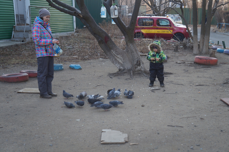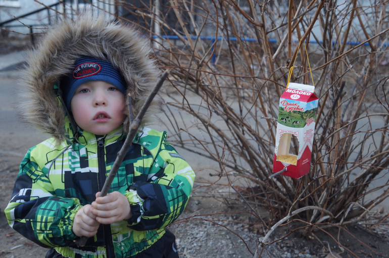 ну и конечно кормим птичек, сделали экспресс-кормушку из тетрапакета