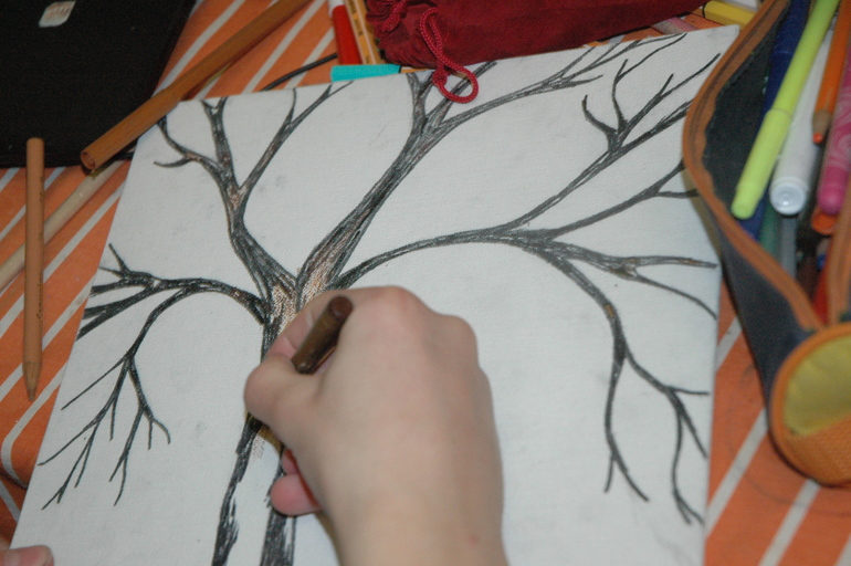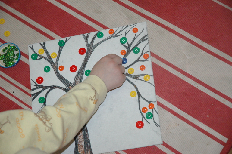 В этот раз мы делали дерево на холсте и украшали его пуговками и зелеными пайетками.