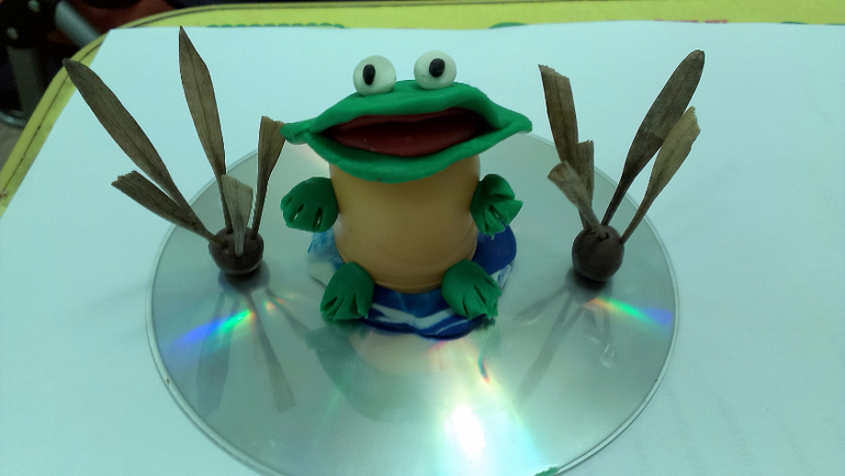 Крепим их к туловищу....И вот, получилась смешная лягушенция....Возможно она где то корявенькая, но думаю это все простительно, тк делает ребенок...