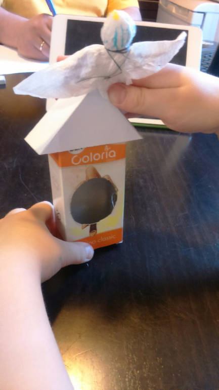 Арина очень огорчалась, что дверца (она так назвала) не открывается, как же туда попадет птичка? И вспомнив про птичек из салфеток попросила сделать скворечник и для них, я на скорую руку только и придумала, что сделать из коробочки от носочков)))) раскрасить надо было, но время уже было позднее, а на следующий день Арина не захотела раскрашивать и так играла, ей все равно, что там ноги торчат))