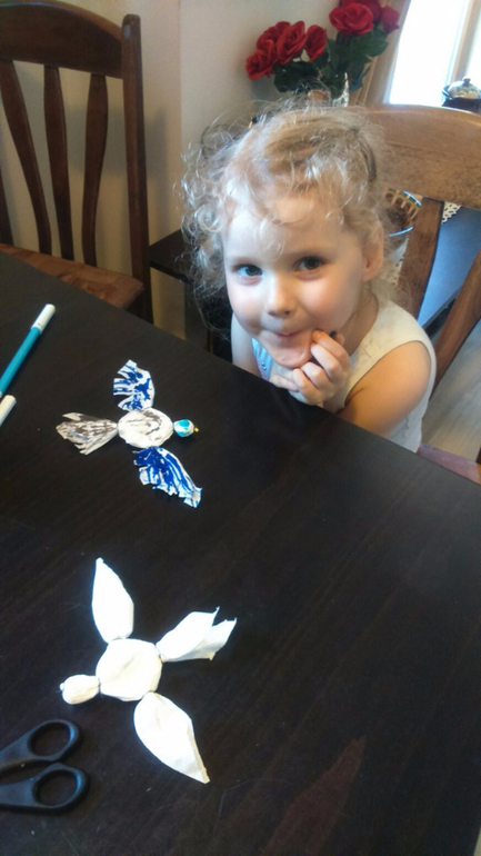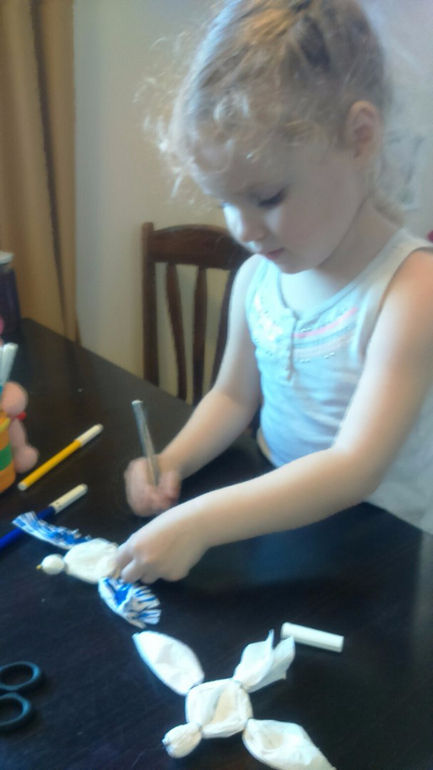 Делали птичек из салфеток, я скручивала нитками, Аришка надрезала перья на крылышках и раскрашивала.
