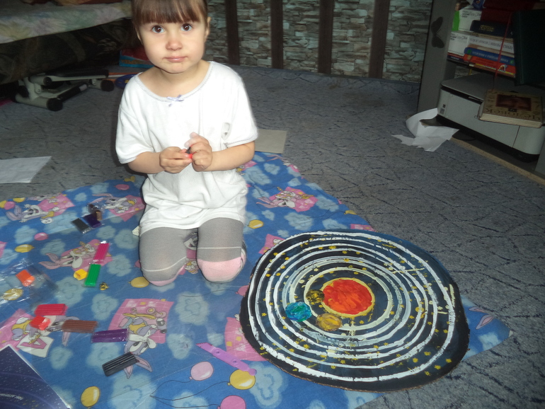 Во время лепки коротко рассказала о каждой планете, Ариша удивилась тому какие разные планеты и сожалела о том, что больше нигде, кроме нашей планеты нет жизни, воды и растительности.
