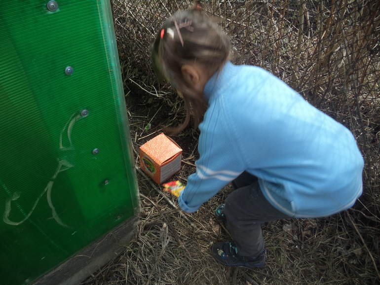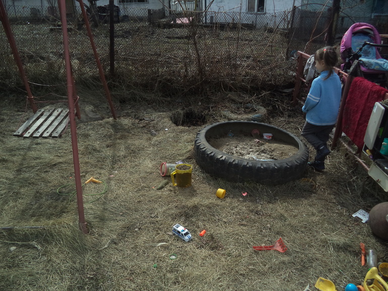Поиграли в игру горячо-холодно. Я спрятала на детской площадке сюрприз, Ариша с помощью моих подсказок искала. Бардачок у нас тут, еще не убирались после зимы.
