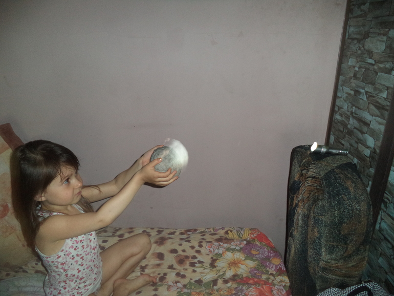 Наш макет Луны долго-долго высыхал, но так и остался влажным. В итоге я сверху соскребла всю бумагу (она так и не приклеилась) и скомкала ее в один шарик.
