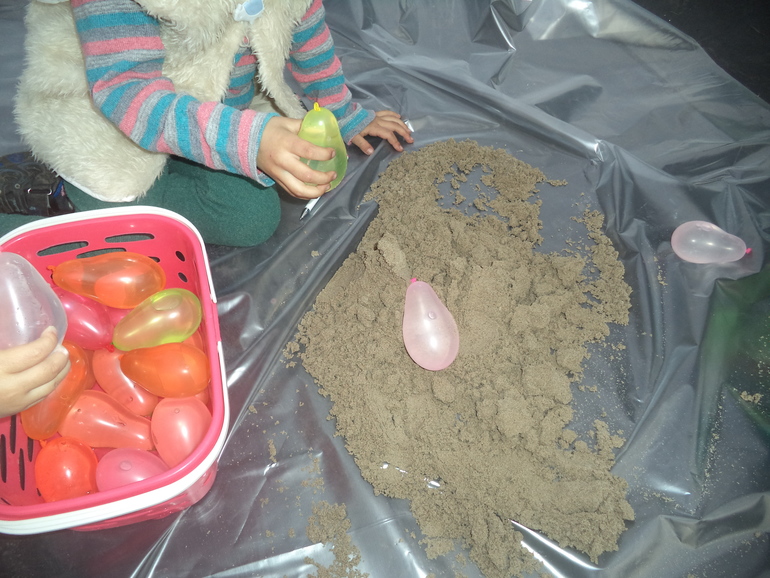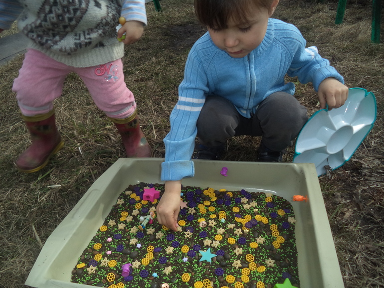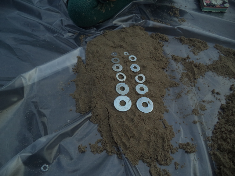 Искали одинаковые гайки (кольца Сатурна) в песке и раскладывали по размеру: