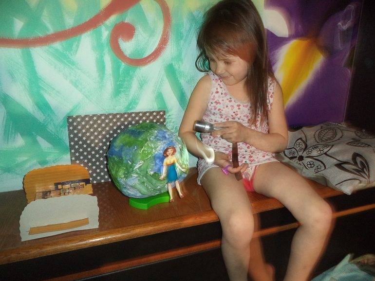 Я рассказывала сказку, Ариша вращала Землю. Сказка дочке очень понравилась, повторов было несколько.
