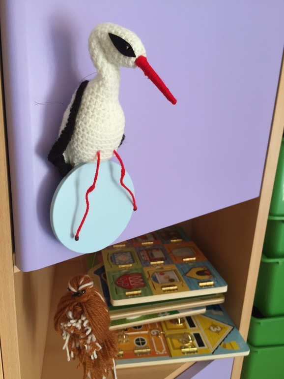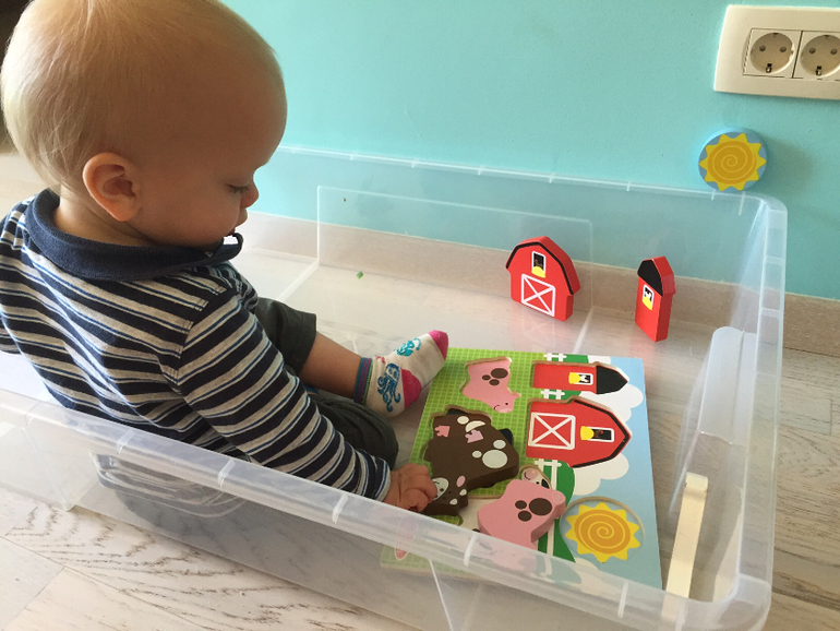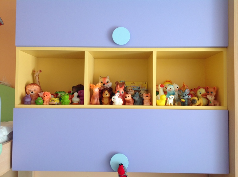 Дома все игрушки рассортированы у нас по контейнерам, пока малыш не подрос, я, планируя игры и занятия, предварительно заранее готовила необходимые игрушечки, что было не самым удобным способом - занимало время, а чаще получалось так, что нужной игрушки не было под рукой. Поэтому здесь решила опробовать новый вариант, у которого свои достоинства и недостатки. Главный из последних - игрушки как источник пыли, поэтому будем наблюдать с какой скоростью она станет накапливаться в здешних условиях. Из достоинств - нужная игрушка всегда под рукой, её видно и точно знаешь, где её найти.