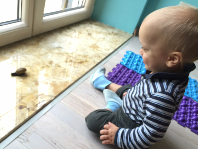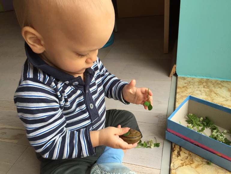 Активно знакомимся с окружающим миром, благо, что за этим далеко ходить не надо. Была у нас вот такая сенсорная коробочка, а в гостях крупная виноградная улитка. Потом сбежала, нашла её на потолке