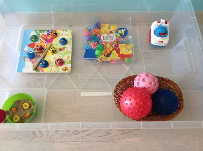 Ну и ,конечно, сенсорим в меру сил и возможностей. Использую вот такой контейнер, содержимое которого обновляю каждый вечер.