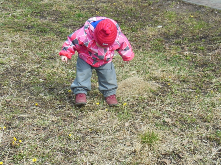 "Немного за тротуаром" отличная полянка одуванчиков. Также там нашли жука, божьих коровок и пенек)