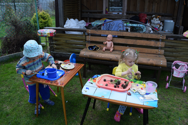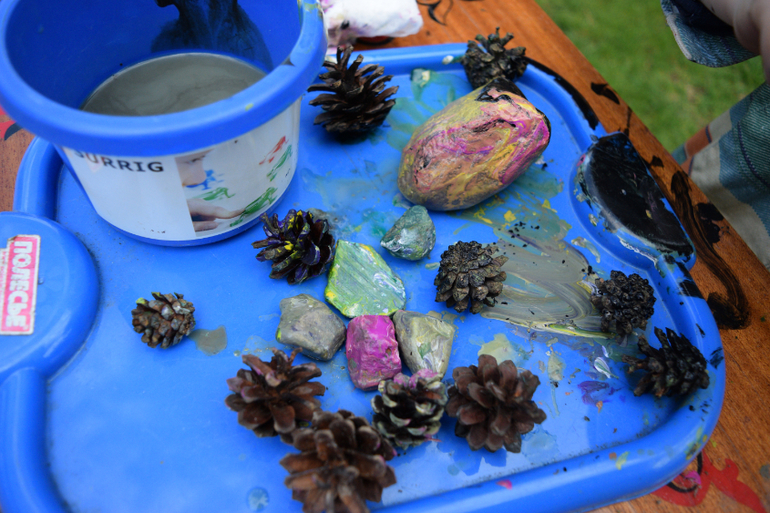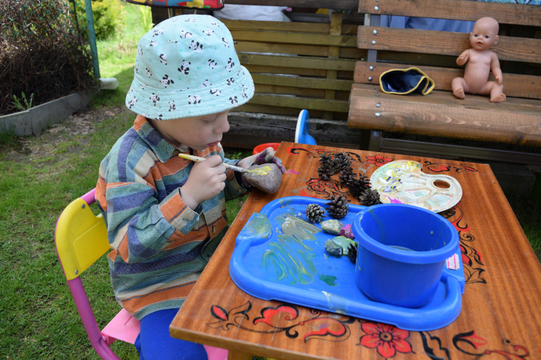 Андрей раскрашивает шишки.Роспись по камню))).