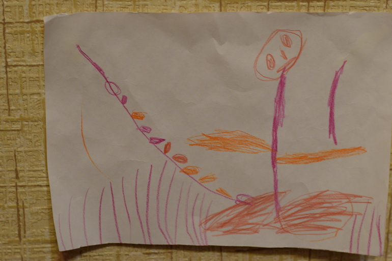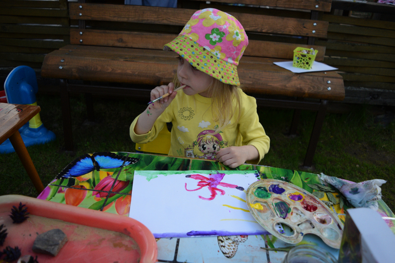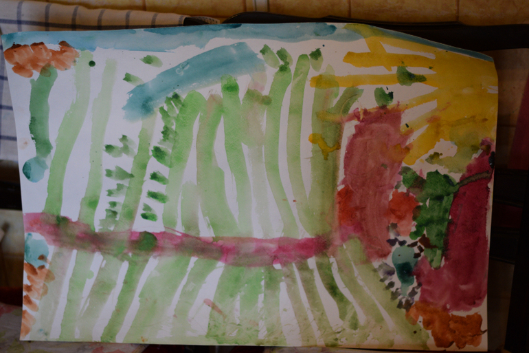 Ну а потом наступил второй этап этого мероприятия - мытье младенцев. Уф, я запарилась. Пока дошли до ванной, я кричала что-то типа:"Ничего не трогаем! Быстро в ванну, Стоять на месте!" Вот такая я мама. Сначала дала краски, потом накричала на маленьких художников. А как быть? Ну двое их))). Отмывала по очереди в ванной полностью с головы до ног. Одного мою, второго ногой прижимаю к ванне. Весело потом было. На стене повесили шедевры и всем показывали и хвастались. Говорить-то еще не умели, но пальцами показывали как надо, с гордостью. Но больше всех гордилась я. И не тем, что дети рисовали, а что я - герой и выдержала такое событие. Сейчас детки подросли, рисуют и красками, и карандашами и мелом и фломастерами. Наша галерея периодически пополняется новыми экспонатами. По результатам на 3 года и 10 месяцев: Алиса рисует конкретно узнаваемые предметы, явления природы, цветы, море, морских обитателей, всяких зайчиков, осьминогов, даже пугало с колоском(умора). Андрей рисует каляки по сей день. Но любит смешивать краски, рисовать разными предметами. Он больше любит конструирование, лепку, разрисовывает машинки и все, что под руки попадает. Но для мальчика это в пределах нормы.