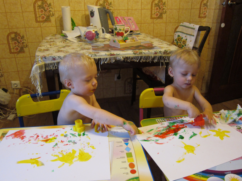 Если честно, я долго готовилась и собиралась с духом, чтобы в один прекрасный день вот так вот БАЦ! И выдать своим двойняшкам краски и бумагу. Я думаю, вы меня поймете. Это 4 грязные руки, 2 чумазые мордашки, размазанные краски по всему телу. Про столы и полы я промолчу. Это не так страшно. Они хотя бы не бегают по квартире и не пачкают стены)))).