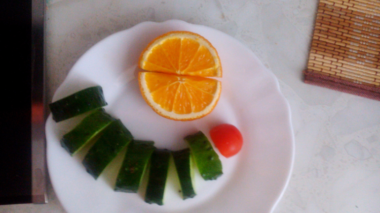 3. Еда. Огурцы не любит. Помидорку слопал))