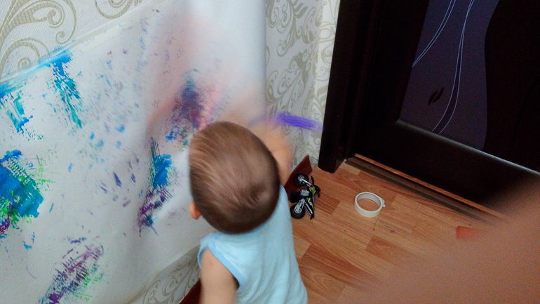 4. Мухи очень назойливые. Спасались от мух мухобойкой))) Повесила лист ватмана в коридоре на стену. Нарисовала парочку мух. Мухобойку покрасили краской и приступили к делу...Лучше дома это не повторять. Хорошо, что обои моющиеся...Слава Богу, муж не узнает, как мама "сходит с ума в декрете")))