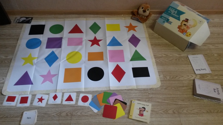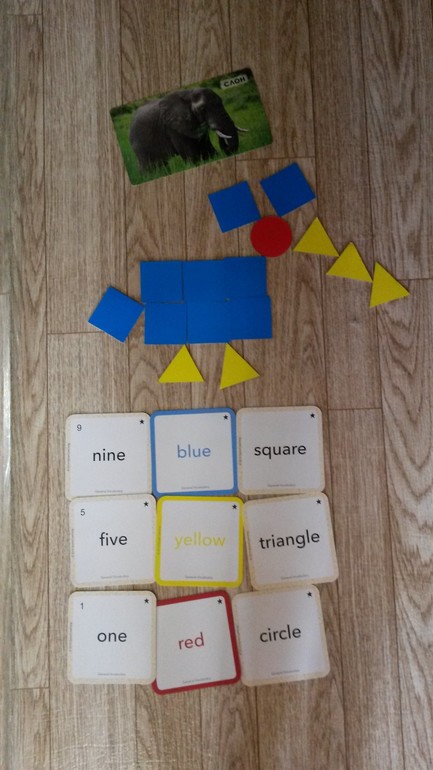 Напрыгавшись, решили немного заняться творчеством. Взяли из «мира на ладошке» любимых животных и выложили из фигур, получилось очень забавно. При помощи карточек Марго самостоятельно описала из каких фигур состоит животное, например,one blue square. Повторили написание цветов, числительных и фигур.