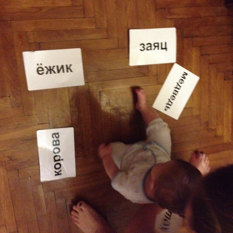 Сегодня начали новый этап в Чтении) изучаем карточки с животными, наобороте написано их название. Выбрали тех животных, которых мы знаем. Видели в книжках, или на других карточках. Посмотрели, и перешли к нашей любимой части) Начали ползать по ним и есть их) Обычно, стараюсь играть в карточки хотя бы 3 раза в день, но сегодня получился только 1раз. Ездили в гости к родственникам, а там живёт кролик) Эмоций много) И самые разные: Удивление, радость, испуг, любопытство. Мирослав долго пытался вытащить его из клетки. А я как - то с ходу и не вспомнила, кто такой кролик. Сказала только, что это животное с длинными ушами, которое делает Прыг-прыг. Когда пришли домой, я достала карточку кролик, показала и рассказала (благо на обороте есть информация) Вообще иногда в ступор вводят некоторые предметы. Как объяснить ребёнку: Что такое солнце? Что такое дождь? Небо? Луна? А это ещё у нас не начался возраст "почемучки". Вот тогда мне придётся голову поломать
