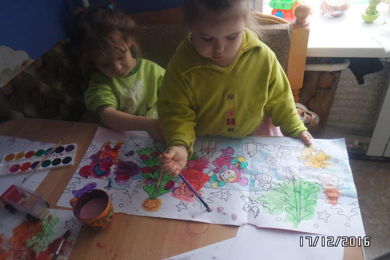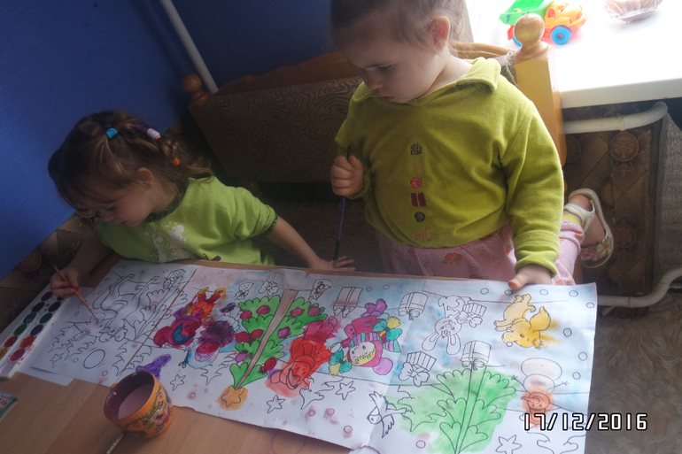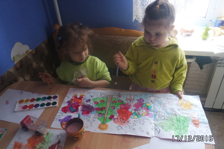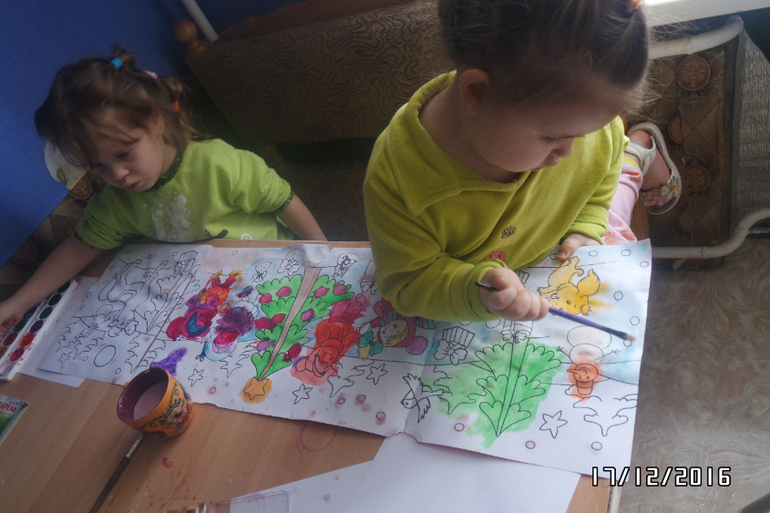 А еще дружно раскрашивали большую зимнюю раскраску...Очень удобно!