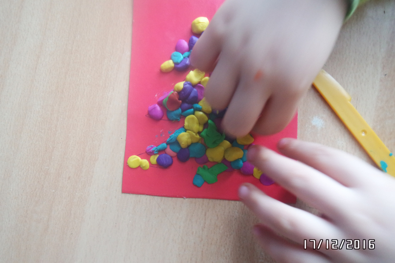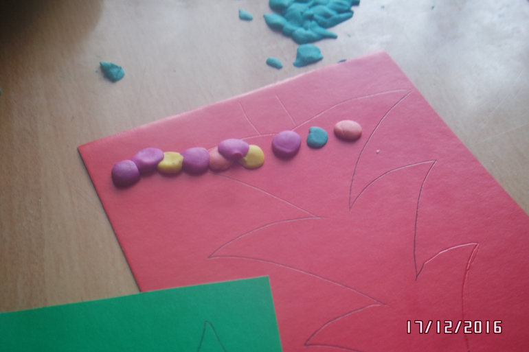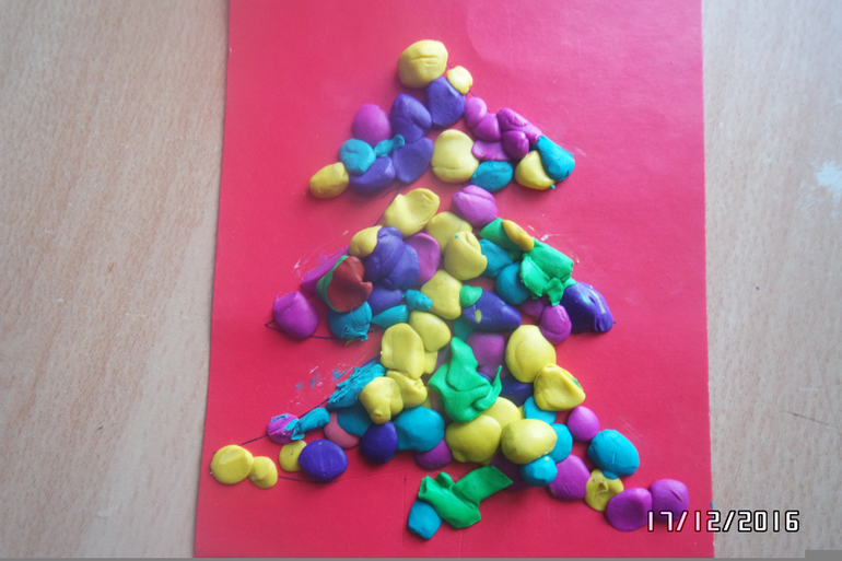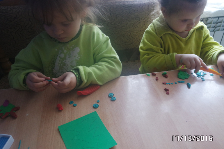 Я дала зелёный пластидин и предложила приклеивать кусочки на шаблон ёлочки. Анюта отклеила мой кружек с ёлочки и приклеила на стол....