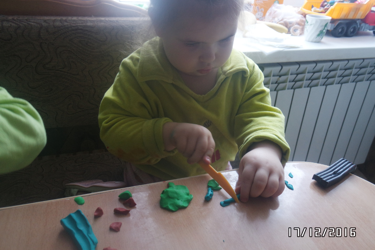 Аня делает пластилиновые колбаски и режит их стеком. Отрезанные кусочки приклеивает дорожкой к столу....и так весь стол....