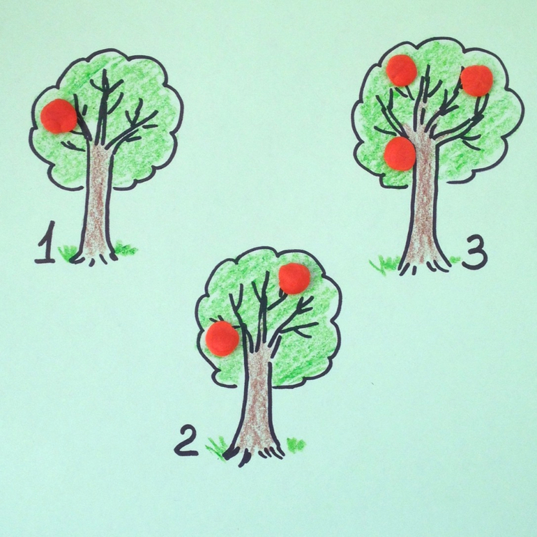 Дальше по плану яблонька. Приклеиваем столько яблочек, сколько написано.
