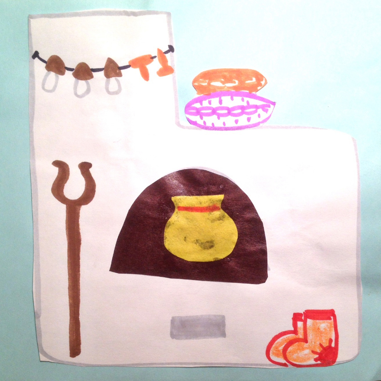Первой Машеньке встретилась печка. Вот ее мы и делаем. Аппликация. Что-то в этот раз я не очень потрудилась над печкой. Можно было горшков побольше приклеить, скамеечку, еще чего-нибудь. Ну ладно, в другой раз.