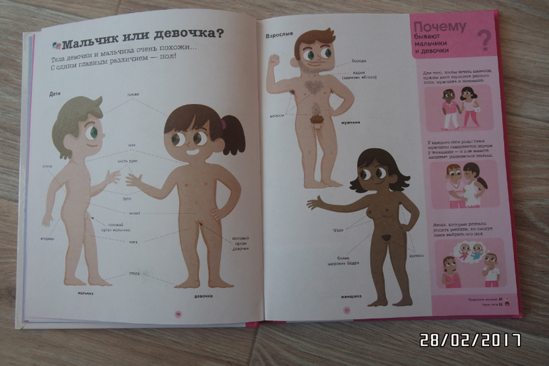 4. Есть изображения обнаженных мужчины и женщины. Вопрос,конечно, спорный....Иллюстрации приличные. У меня три дочки и я посчитала, что так мне будет проще обьяснить разницу между мальчиком и девочкой. Уверенна, что в возрасте 4-5 лет это не травмирует психику! Для интереса я посоветовалась с мужем, он оказался против... Уже год он читает эту книгу детям, но иллюстрацию не заметил))))).