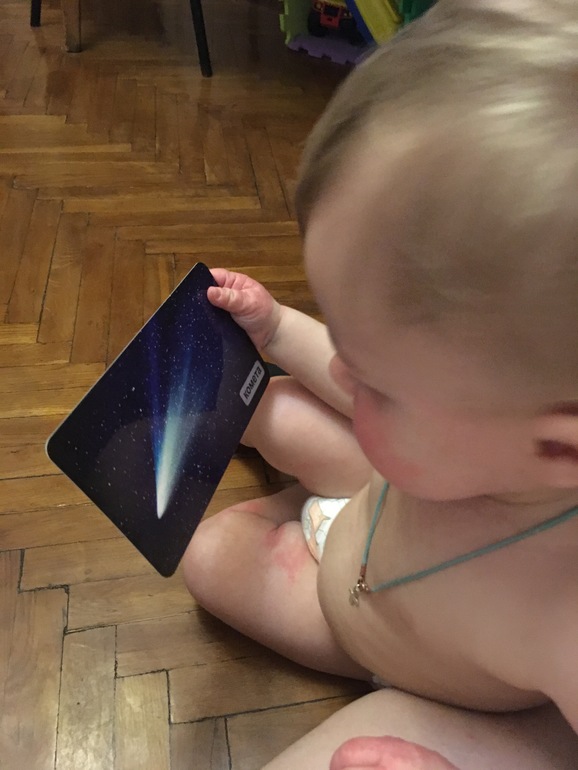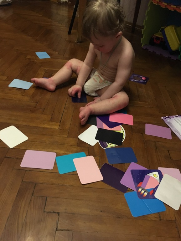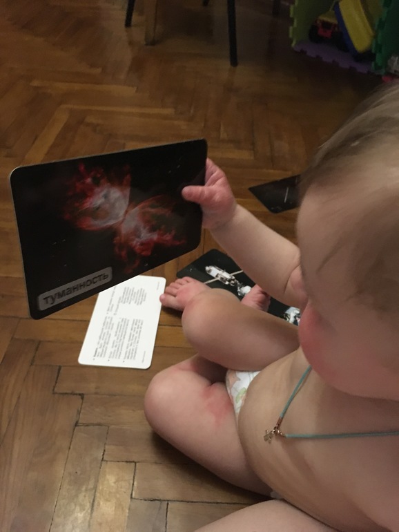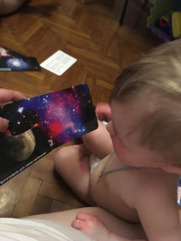 Игры для малышей от 0 до 3 летСыночек выздоровел до конца. Только дерматит обострился сильно. Внезапно, он решил перейти на один сон, который длится 1,5 часа. К слову, до болезни у нас было 2 сна, утром 1 час и в обед 3 часа. Выспался, блин. Он то перестроился, а я ещё нет😕. Бошка гудит, сил нет, вечером сопли и температура 38. Почему бы и нет, давно не болела. Но не все так печально. Мирослав же не понимает, что мама себя плохо чувствует, поэтому требует развлечений, как прежде. А я что... развлекаю и играя вместе с ним, забываю о болезни) сегодня весь интернет пестрит "День космонавтики". Для меня эта тема близка) с детства увлекалась космосом, и жила раньше на ВДНХ, а там музей космонавтики. Когда училась в школе, нас туда каждый год водили. С Мирославом устроили космическое небо с помощью цветных карточек, вокруг которых кружили инопланетяне. Куча карточек в одном месте-это же круто! Их можно раскидывать, подбрасывать. Потом я взяла трафарет ракету и с помощью карточек меняла цвет ракеты. Получилось просто и интересно. Ракета высоко летала и в процессе полёта меняла цвета. Мы пересмотрели всю эту кучу, а это 26 разных оттенков и сын не отвлёкся ни на секунду. Потом достали карточки Мир на ладошке "Тайны Космоса" (это мой любимый набор) Мирослав вытаскивал из конвертика по одной, а я озвучивала и объясняла. Хотела ещё нарисовать звездное небо. Но мое состояние "сказало" иди спать. Порисуем завтра.