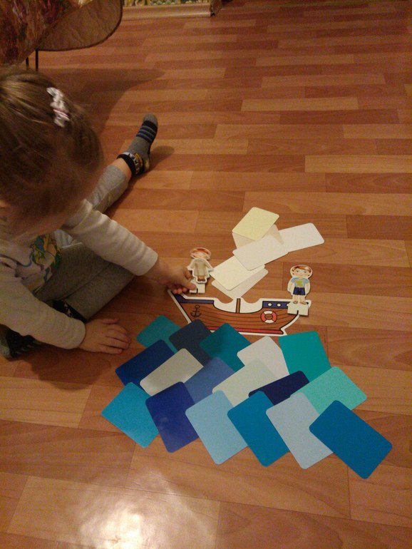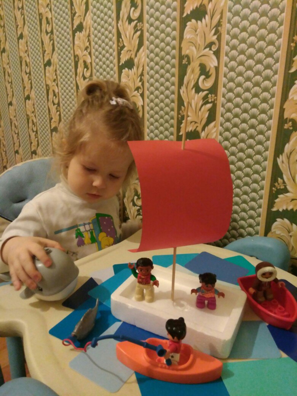 В завершении сделали парусник из пенопласта. Хотели с ним поиграть в ванной, но, как назло, отключили воду((((( пришлось спасать ситуацию, сделали океан из синих карточек-оттенков и обыграли с фигурками Лего.
