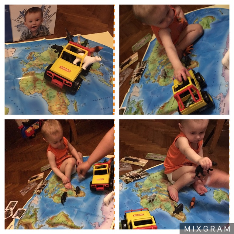 Игры для малышей от 0 до 3 летМы продолжаем баловаться географией . Именно, баловаться, потому что достаём ее пару раз в месяц. Она же от 2-х лет, но нам нравится с года. В методичке была игра "облететь все материки на вертолете". Я ее немного переделала. Я погрузила наших животных в джип и начали развозить их по материкам, где они живут. Но, т.к. большинство наших животных из Африки, то мы просто катались по карте, останавливаясь у каждого материка. Я рассказывала основные факты о них. Подключили карточки из Мира на ладошке, там то больше животных, чем у нас) По окончанию занятия, как обычно похвалилась Мирослава. Но, сын не собирался заканчивать, сидел, возил джип, тыкал пальчиком везде. Я пошла на кухню и оставила папу заканчивать игру) Он же у нас отвечает за весь окружающий мир) Занималась своими делами и краем уха слышала, как они посмотрели все! И Пизанскую башню, и большой каньон, и животных и растения) Фигурки животных-это универсальная вещь, с ними кучу игр можно придумать. Вот я и думаю купить сразу хороший, большой набор, типа "Шляйх". Есть у кого-нибудь такие? Цена оправдана?