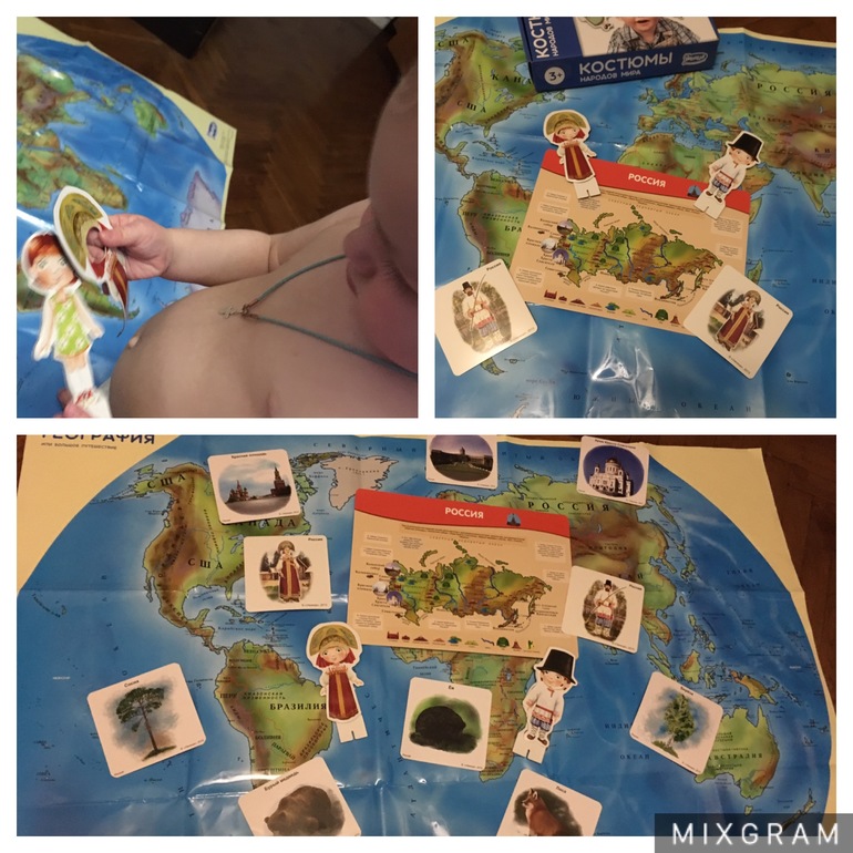 Игры для малышей от 0 до 3 летВот, блин, мамы, такие мамы. Мне на день рождения подарили деньги, в итоге, почти все потратила на сына. У кого так же?) Зашла в Глорию джинс, накупила одежды сыну на 3000₽. И вроде, все такие дешёвое. Футболки по 150₽, шортики по 250, носочки, кофточки. По дороге в детский мир, а там подгузники по акции, карандаши нужны новые, ой какая пирамидка интересная и понеслось. Остановилась я только в Умнице. Когда уже тратить нечего было) Теперь у нашей географии пополнение. Костюмы народов мира и Флаги и гербы. Позже напишу про Флаги. Костюмы меня очень порадовали. Там 2 персонажа Маша и Митя, они путешествуют по разным странам примеряя на себя наряды этих стран. Это магниты, просто прикладываешь костюм в Маше и отправляетесь в путешествие) Всего 30 женских и 30 мужских костюмов, ну и карточки с изображением нарядов и почему они приняты в этих странах. Возраст на коробке стоит 3+. И это оправдано. Пока сын просто одевает куколок и возит ими по карте. Одевать ему понравилось больше всего. Мне особенно понравилось, как в детстве) Мне бабушка раз в месяц покупала журналы, где надо было вырезать бумажных кукол и наряды к ним) где бы такие найти сейчас)