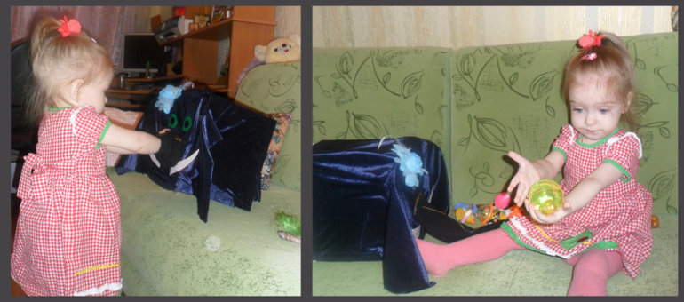 В основе лежит всем известная игра "Волшебный мешочек", в которой на ощупь отгадываются предметы. Наша слониха сначала ходит по квартире и с характерными звуками (издаваемые мамой) всасывает своим хоботом всякие занятные вещички. Потом начинается самое интересное! Ребенок засовывает руку в хобот, и с трепетом предвкушения начинает доставать все это богатство.