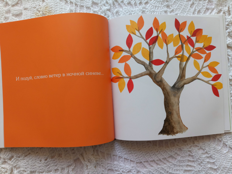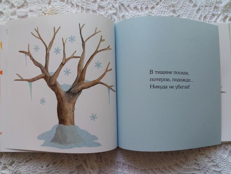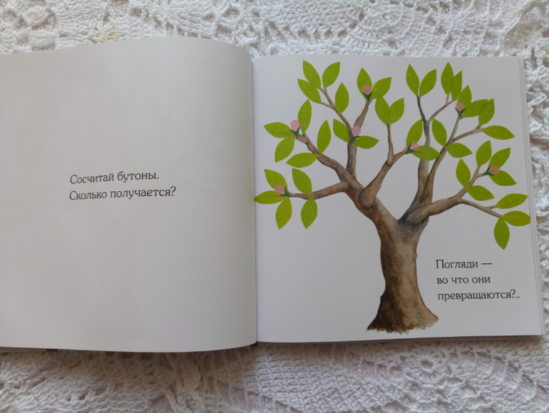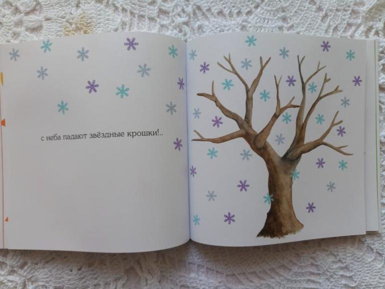 Мне всегда было сложно показывать изменения в природе, дети трудно воспринимают смену времён года. Новая книга очень и очень чудесна. Здесь постепенно, с малейшими изменениями изображено дерево во все времена года. Видно , как растаял снег, капель, первые листочки, первые цветочек, цветение....К тому же такой спокойный тепм смены погоды сопровождается действиями малыша. Автор в стихотворной форме предлагает малышу потрогать, поступать, погладить, понюхать, посчитать... Людочке книга очень нравится!!!