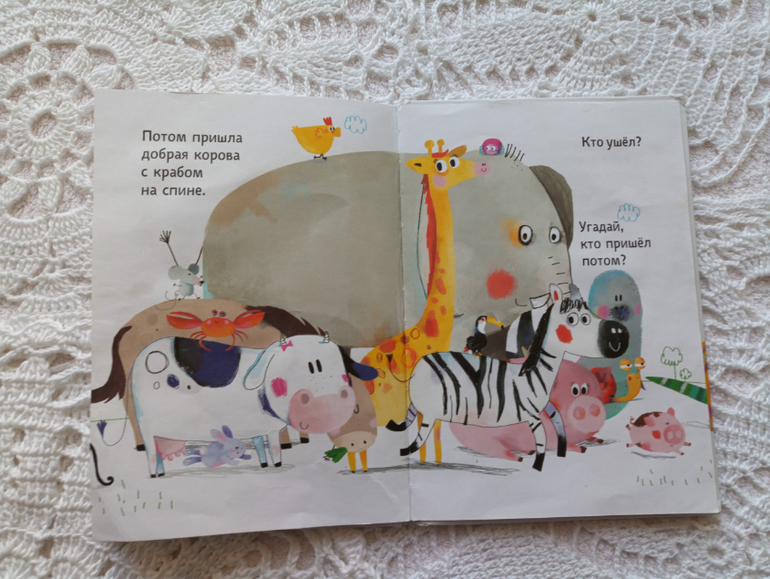 Книга для развития внимания и памяти. Покупала трехлетней Анюте. Она упрямо игнорирует все виммельбухи , игры на развитие внимания, памяти... Все то, что обожает старшая дочь, не могу подать средней... И вот мое первое ( и уже год единственное) спасение. Анечка очень любит листать страницы....этого нет в виммельбухах... А здесь хохочет, играет в прятки со зверями)))) Ей очень нравится!!! Книга на 100% оправдала ожидания. И даже больше...младшая рассматривает ее с года... Кстати, иллюстрации мне не нравятся. ..Но маленькая дочка ее часто приносила и тыкала пальцем, спрашивала кто?, рассказывала кто как говорит. А ближе к 2 годам стала играть в прятки!!! Сама начала говорить " Ой, мяу-мяу нет"....))) И задорно хохочет как Анюта))))
