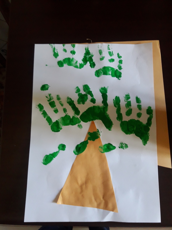 -Сделали дерево. Ствол -элемент аппликации, крона- рисование ладошками