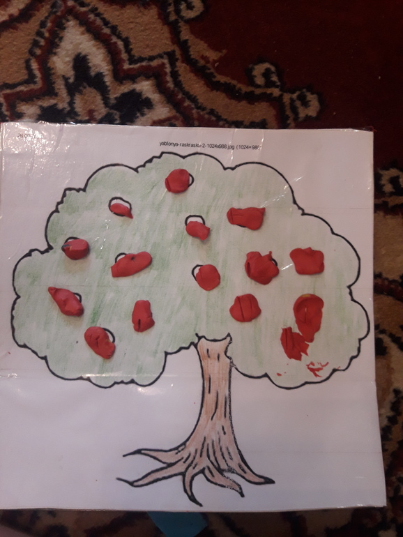 - Пластелиновые заплатки. Сыну не нравится, но я уговорила сделать и посчитать яблочки