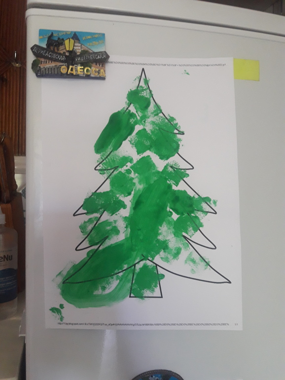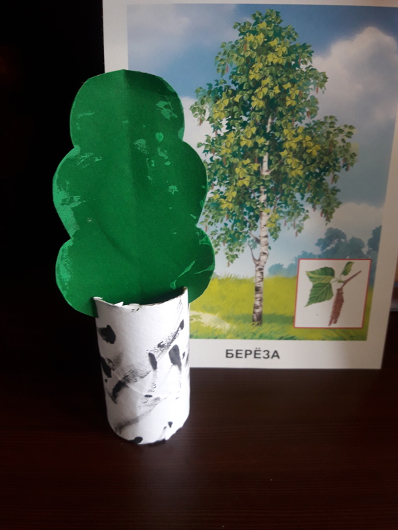 - заготовки: рулон туалетной бумаги обклеила белой бумагой, из зеленого картона вырезала крону дерева. Сынок пальчиками нарисовал черные точки на рулоне, получился ствол березы, обратную сторону кроны разукрасил пальчиками в зеленый цвет. Все соединили-получилась березка.
