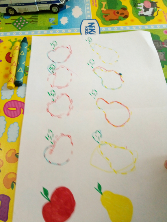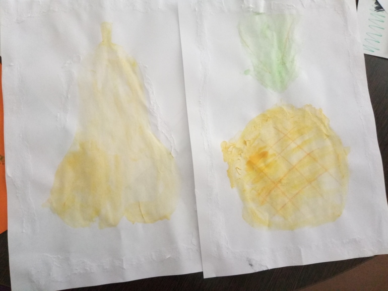 Рисовали красками при помощи трафарета (2 листа клеим друг на друга. на оном вырезаем грушу или ананас, потом губкой рисуем, потом отклеиваем верхний слой и получается груша/яблоко)