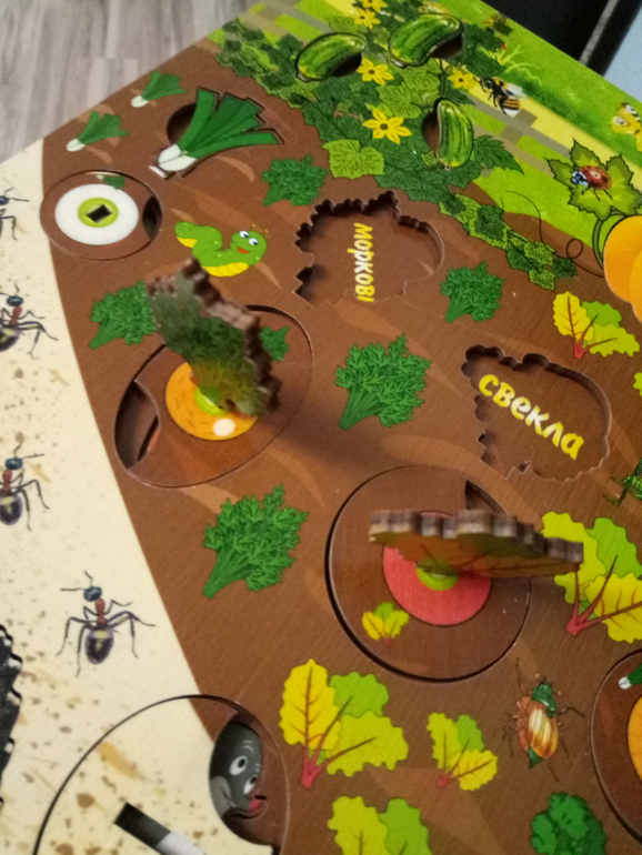 Играли с бизибордом (хороший бизиборд, детям нравится, только овощи с усилием в разъём входят. А в целом мне нравится).