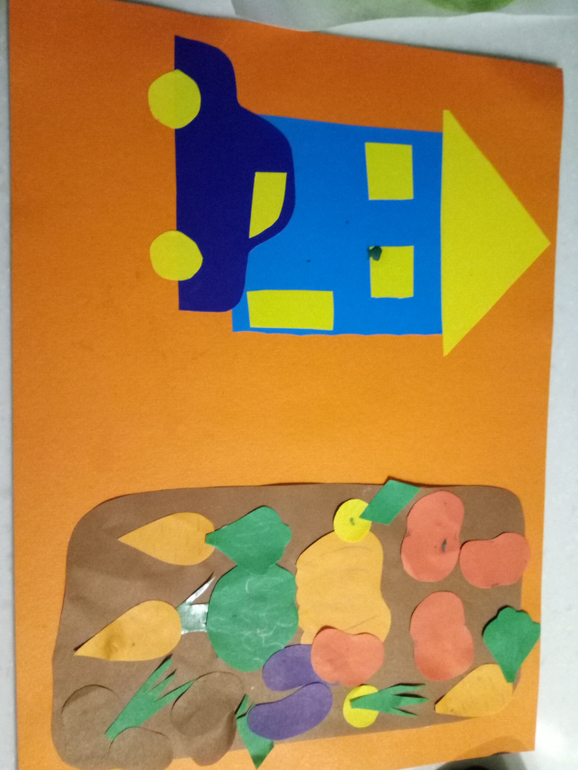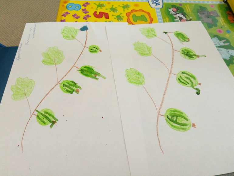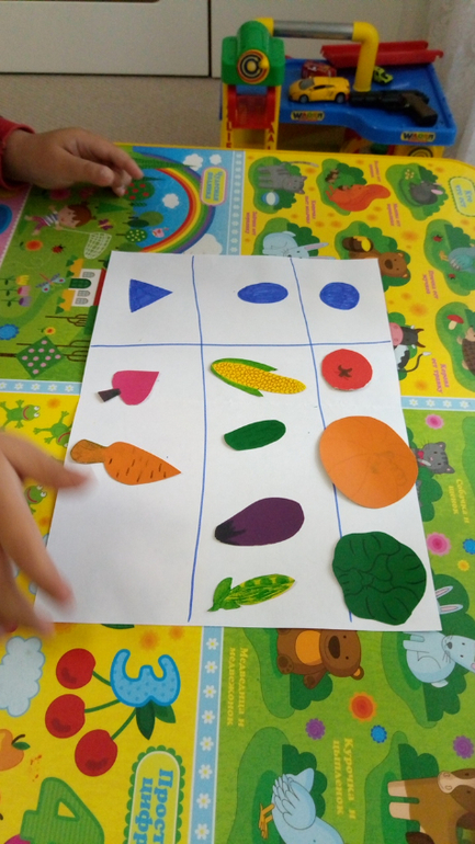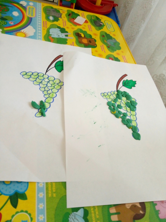 После мы с ребятами сделали аппликацию (слива, кукуруза, виноград). Делали заплатки на овощах, фруктах. Я делаю такие вещи в двойном экземпляре, чтобы младшая тоже приняла участие и не крушила всё вокруг.