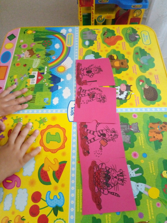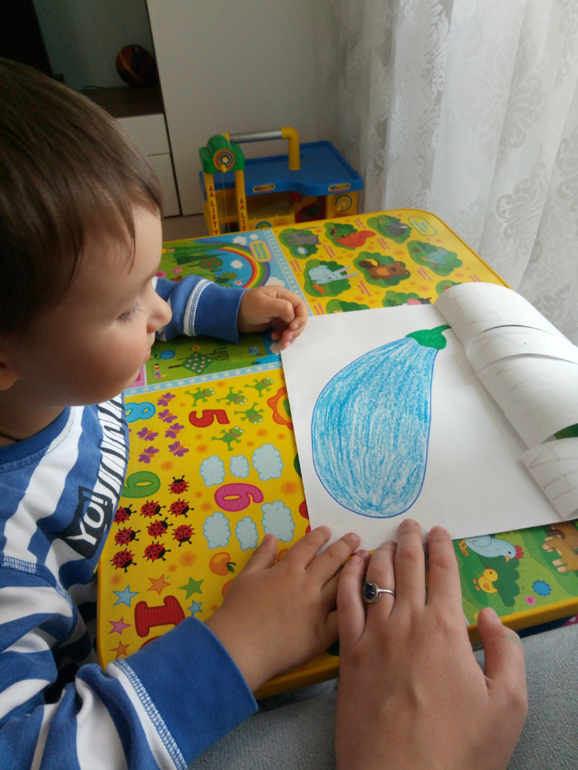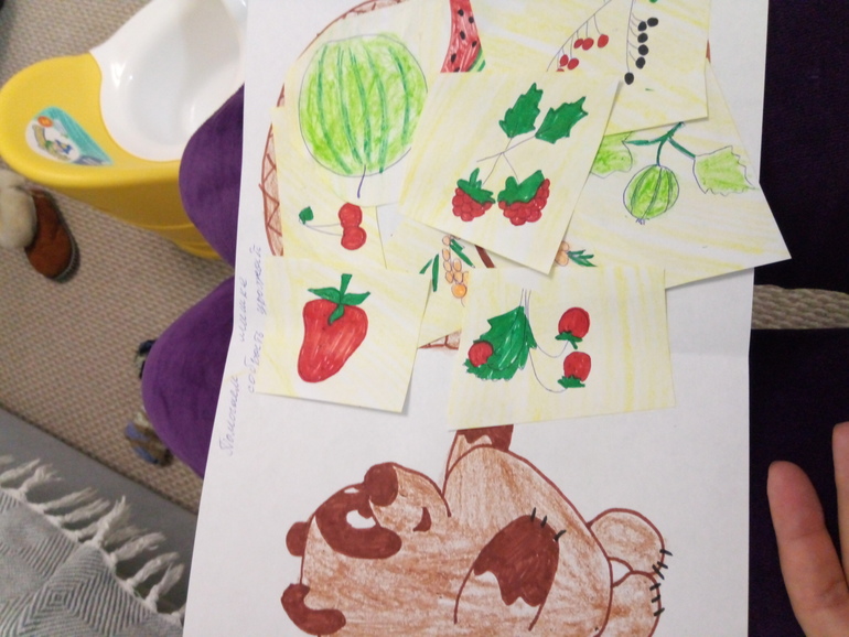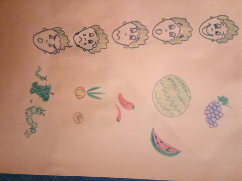 Немного обсуждали эмоции (мальчик плачет от лука, потому что лук едкий; мальчик расстроен потому что червячки съели его яблоко; мальчик удивился потом что увидел большой арбуз; мальчик рад потому что будет есть виноград; мальчику не нравится есть жгучий перец)