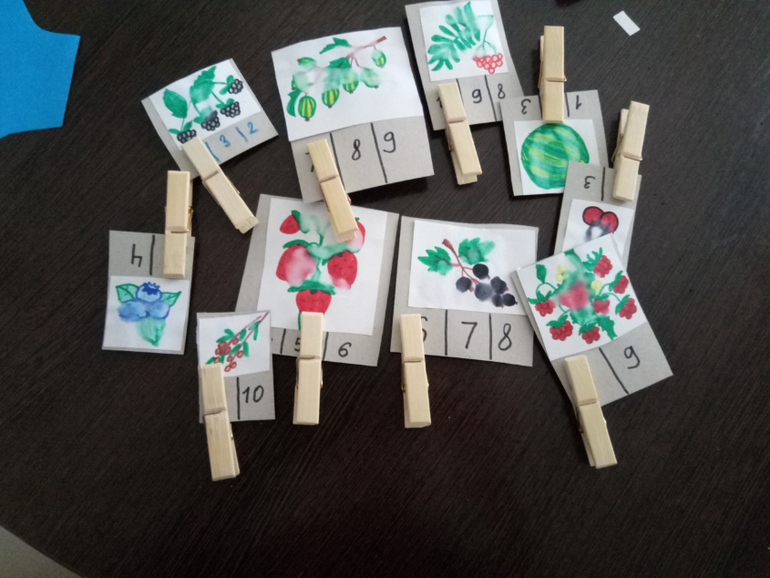 Задания на счёт (помогали зверям подготовиться к зиме, раскладывали по сумкам морковку; просто считали ягоды и к нужной цифре прикрепляли прищепку)