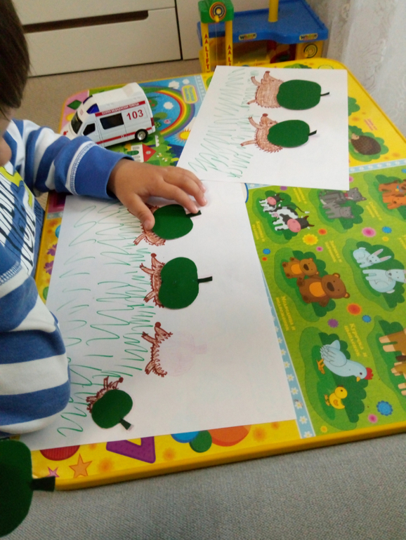 Помогали ёжикам донести яблочки (сопоставляли по тени, плюс повторение большой и маленький)