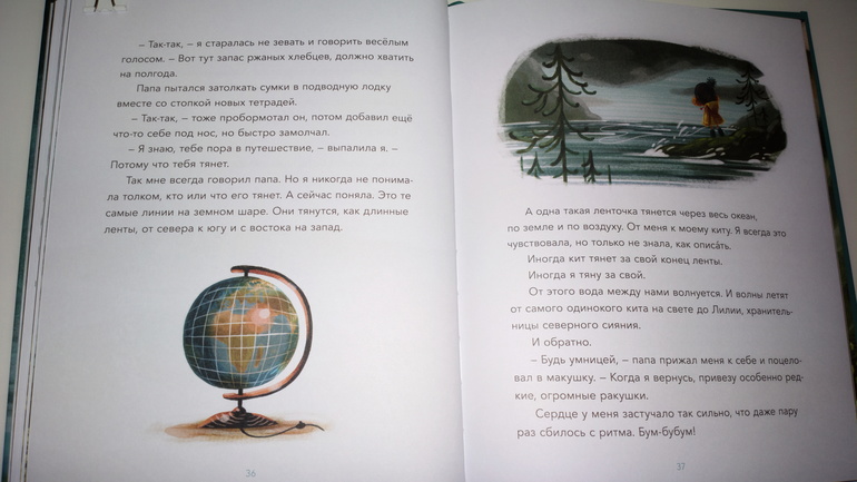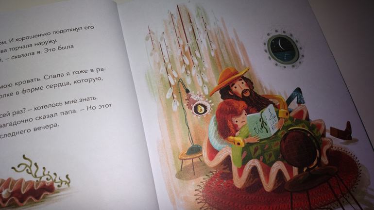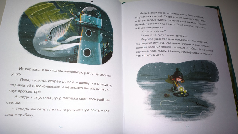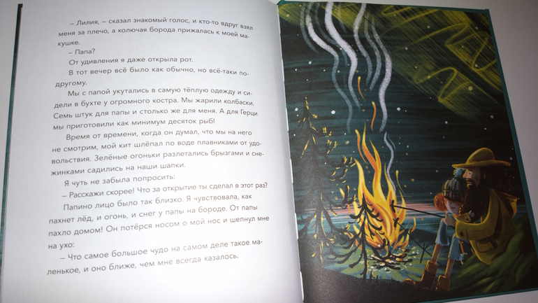 "Я чуть не забыла попросить: - Расскажи скорее! Что за открытие ты сделал в этот раз? Папино лицо было так близко. Я чувствовала, как пахнет лёд, и огонь, и снег у папы на бороде. От папы пахло домом! Он потёрся носом о мой нос и шепнул мне на ухо: - Что самое большое чудо на самом деле такое маленькое, и оно ближе, чем мне всегда казалось."