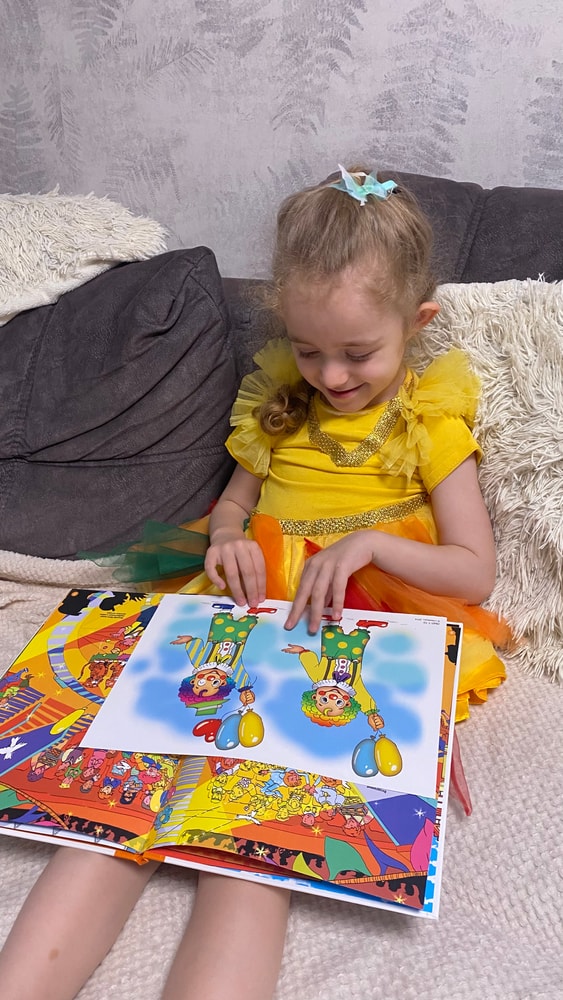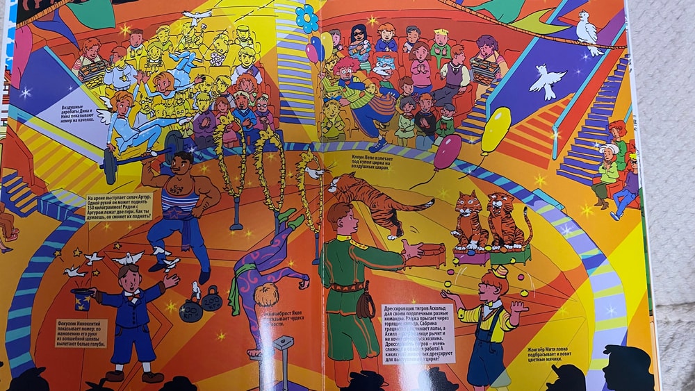 Вспомнили, как ходили в цирк и приступили к рассмотрению виммельбуха. Сегодня знакомились с профессией клоун и мим.