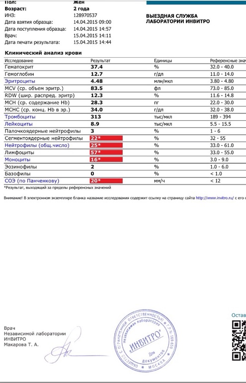 У нас вот какая ситуация: дочка (2 полных года, в начале мая будет 3) кашляет уже неделю. Кашель мокрый, но мокроту она не выплёвывает (со скандалом), насморк (сопелек много и они зеленоватые), 4 дня была температура от 37,5 до 38,9. Пьём сироп Лазолван, в носик Гриппферон, промываем нос Аквамарисом. Температуру выше 38,5 сбивали Нурофеном. Наш участковые педиатр прописала нам антибиотик. Я пока не стала давать, сдали кровь на клинический анализ (результат прилагаю). Подскажите, у нас вирус? Чем его можно победить?