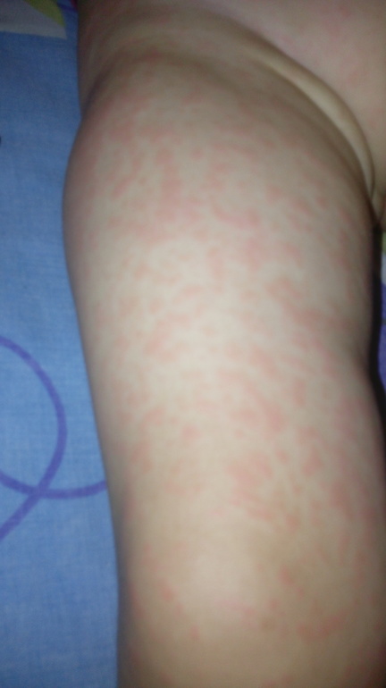 Здраствуйте!Вчера гуляли с ребенком,она есла глазурованный сырок,пила сок с булочкой,потом легли на дневной сон,проснулась и я увидела у дочки красную сыпь пятнами по всему телу.Что это может быть?аллергия?ребенок ведет себя как обычно,темпер.нет,не чешется.Что дать из лекарств?