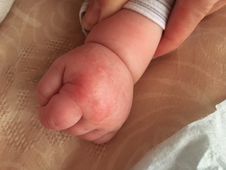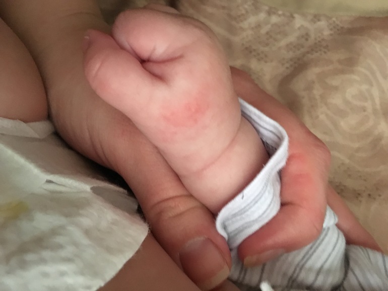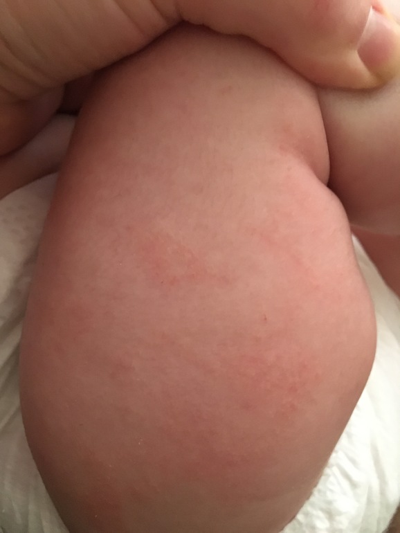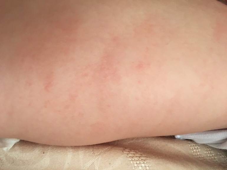 Здравствуйте такой вопрос. Были у врача уже раза 3. Появилось это у нас в 2 месяца. Вначале по чуть чуть щас уже почти все тело покрылось. Первое было на руках и щеках потом икры коленки спина живот локти. Сдавали посев там все хорошо. Исключила порошок и пенку pigeon. Алергиков нет. Кожа как гусиная. Если появляется то с двух сторон одновременно.