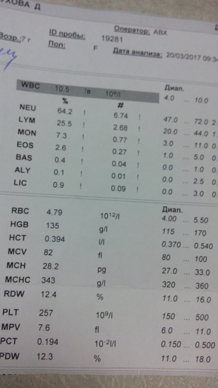 Педиатр (другая, не та, что в первый раз слушала) подтвердила, что легкие чистые, горло нормальное (изначально сказала так, в конце приема почему-то выписала ОКИ...). Моча также в норме, Но лейкоциты в крови по ее мнению, говорят о бактериальной инфекции. Где она - не ясно, но она есть.