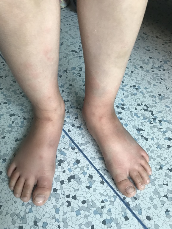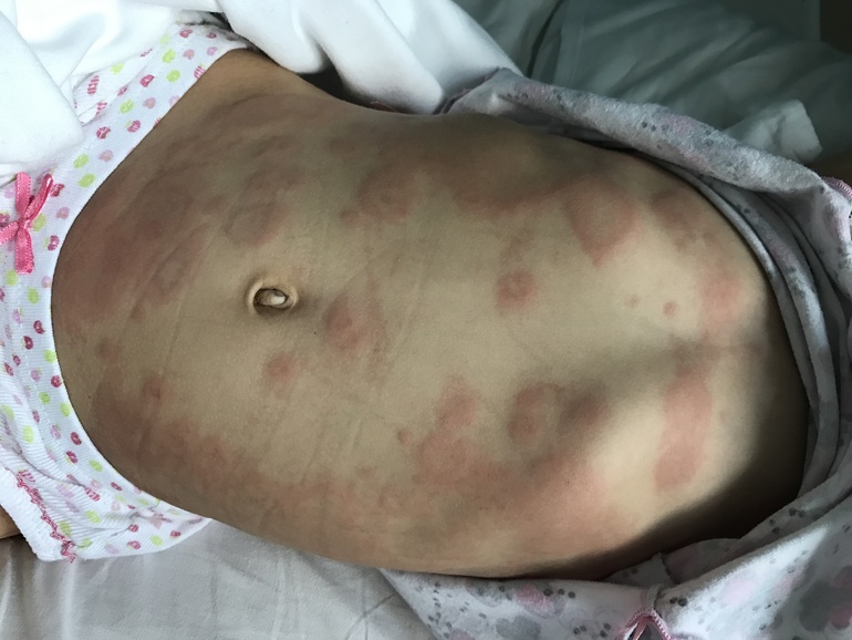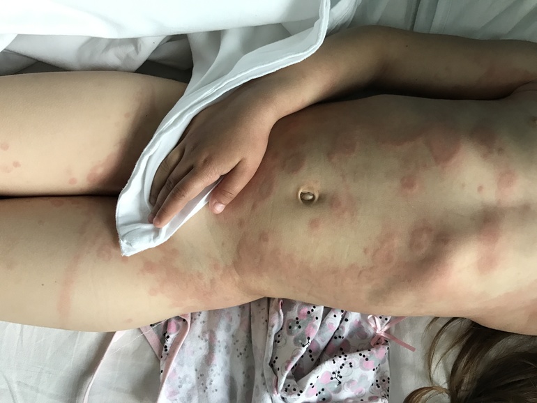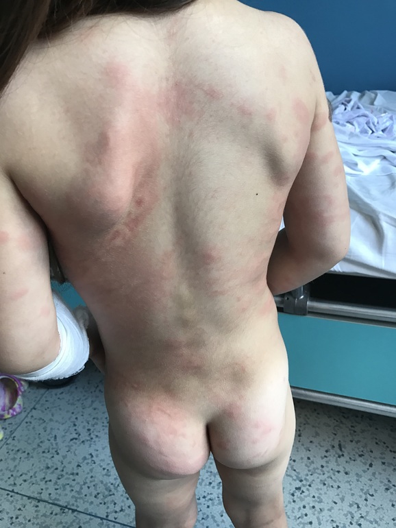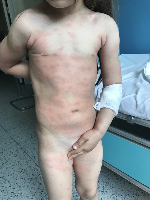 Здравствуйте! Лежим в больнице второй день. Врачи не могут определить, что с нами. Началось все 2 дня назад, утром ребёнок проснулся с температурой 39 и ужасными красными пятнами, а в пятнах как будто бы ещё пятна. Пятна очень чешутся. Опухли все суставы до посинения на руках и ногах, жаловалась, что ходит не может, болят ручки и ножки, поехали сразу в инфекционное отделение, положили, прокапали раствор Рингера, я давала и Зодак и Супрастин и мазала Псило- бальзамом и Фенистилом, все без толку, второй день ставят уколы Цефтриаксон, периодически поднимается температура до 37-38 градусов. Высыпания стали ещё больше.
